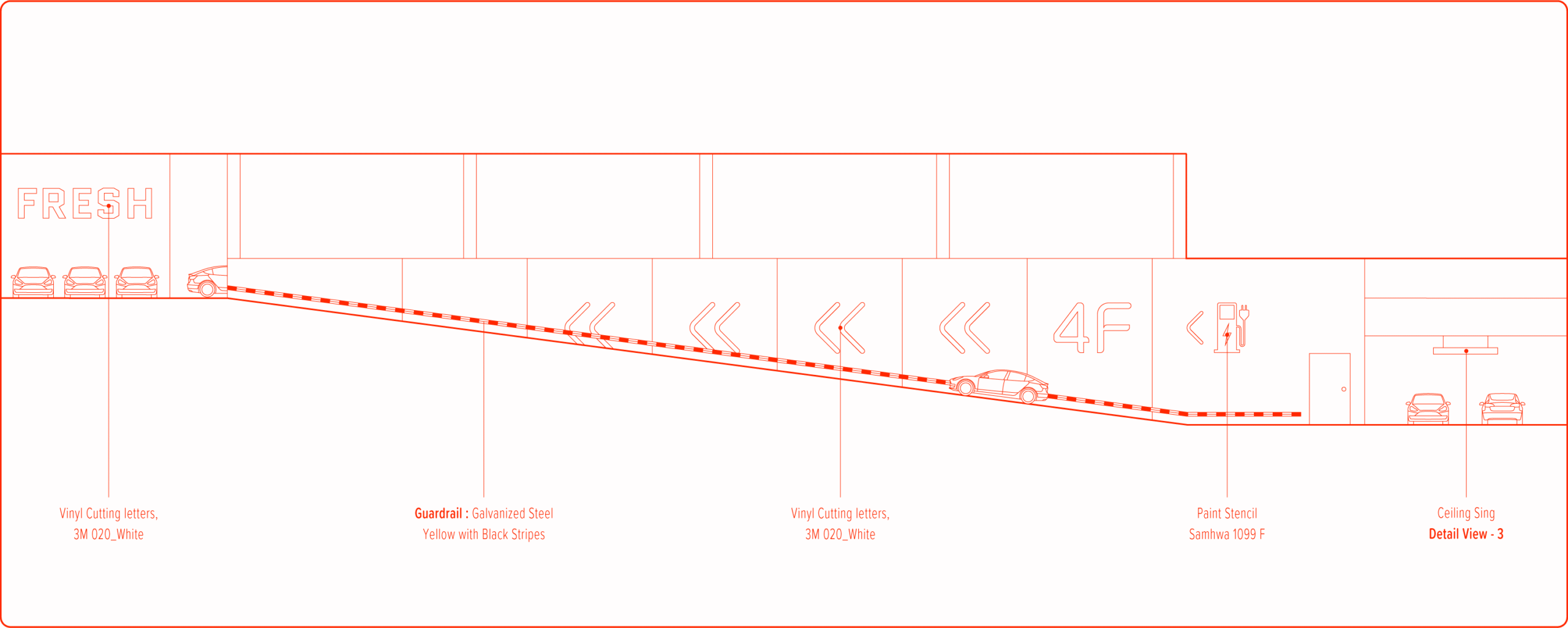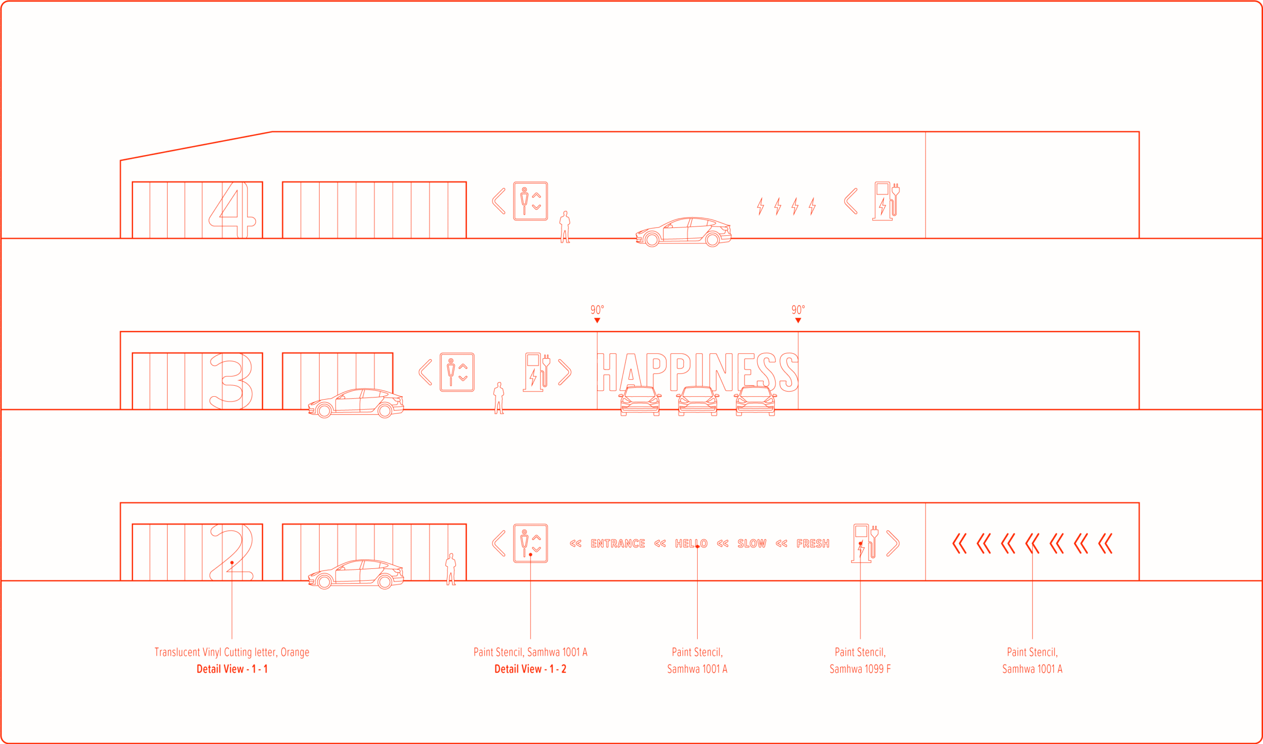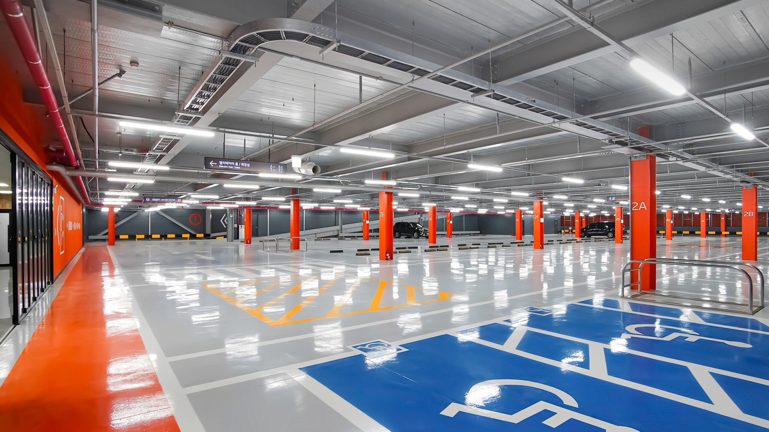 주차공간에서 브랜드의 색채와 정체성을 어떻게 구조와 그래픽에 반영해, 이용자의 동선을 안전하고 직관적으로 안내하며 동시에 브랜드와 고객의 연결을 강화할 수 있을까?